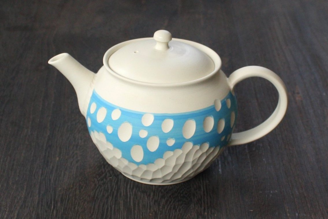 憲児陶苑 白泥ポット 青水玉カット セラメッシュ(陶製茶こし)kenji015