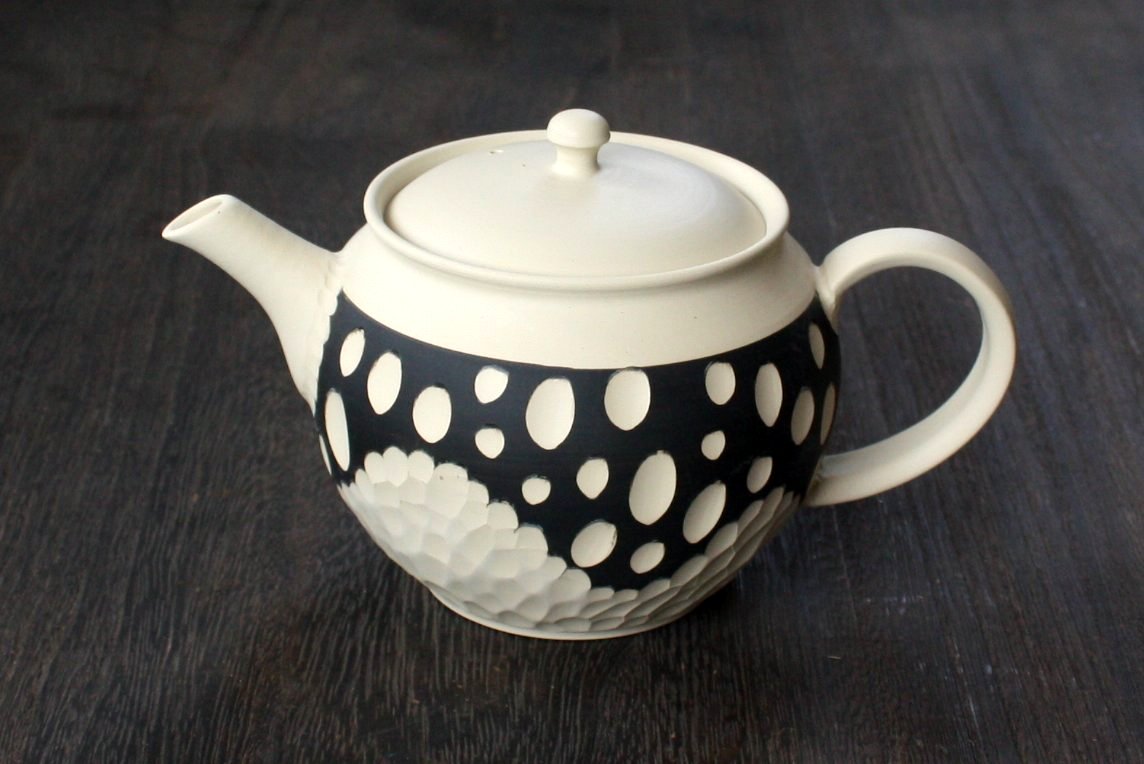 憲児陶苑 白泥ポット 黒水玉カット セラメッシュ(陶製茶こし)kenji016