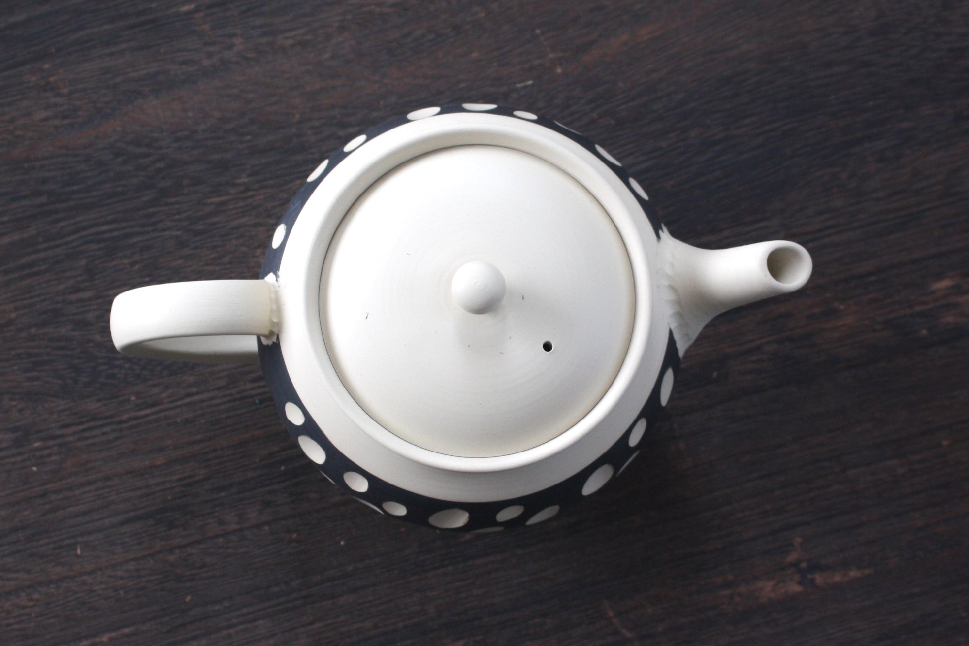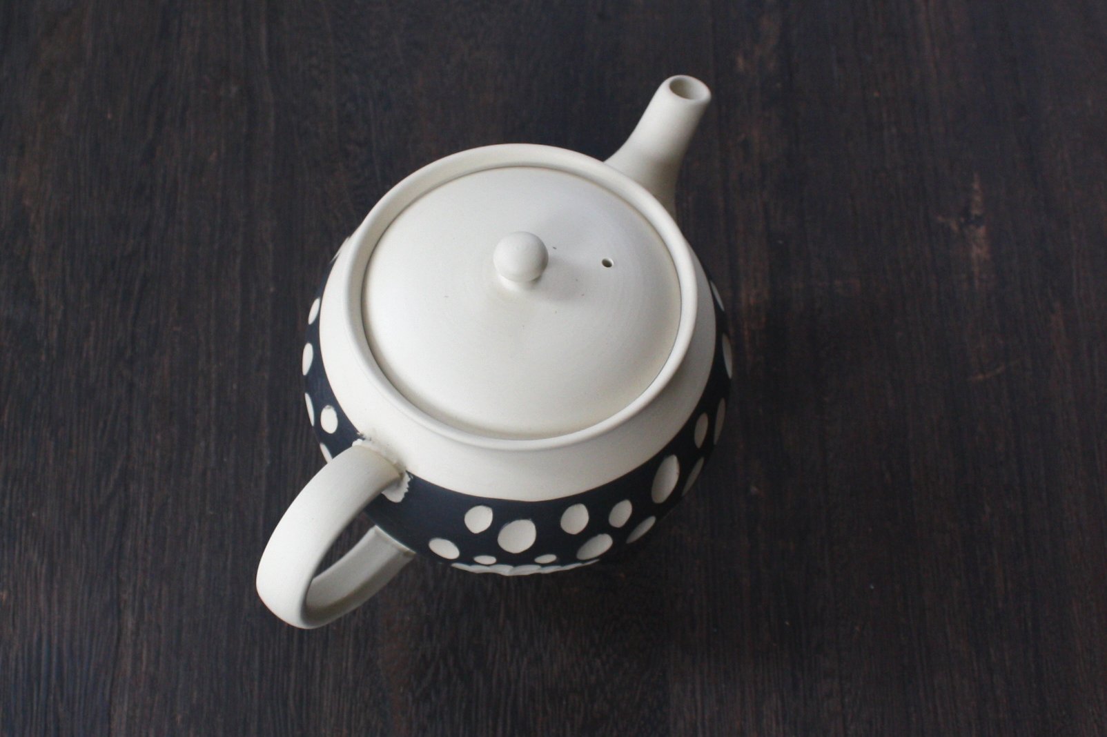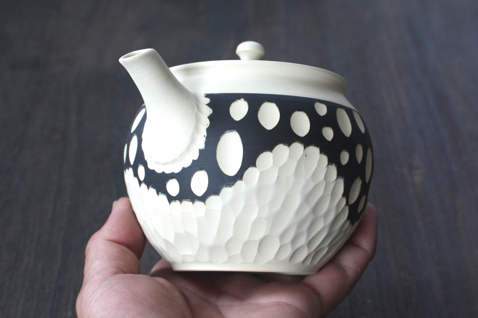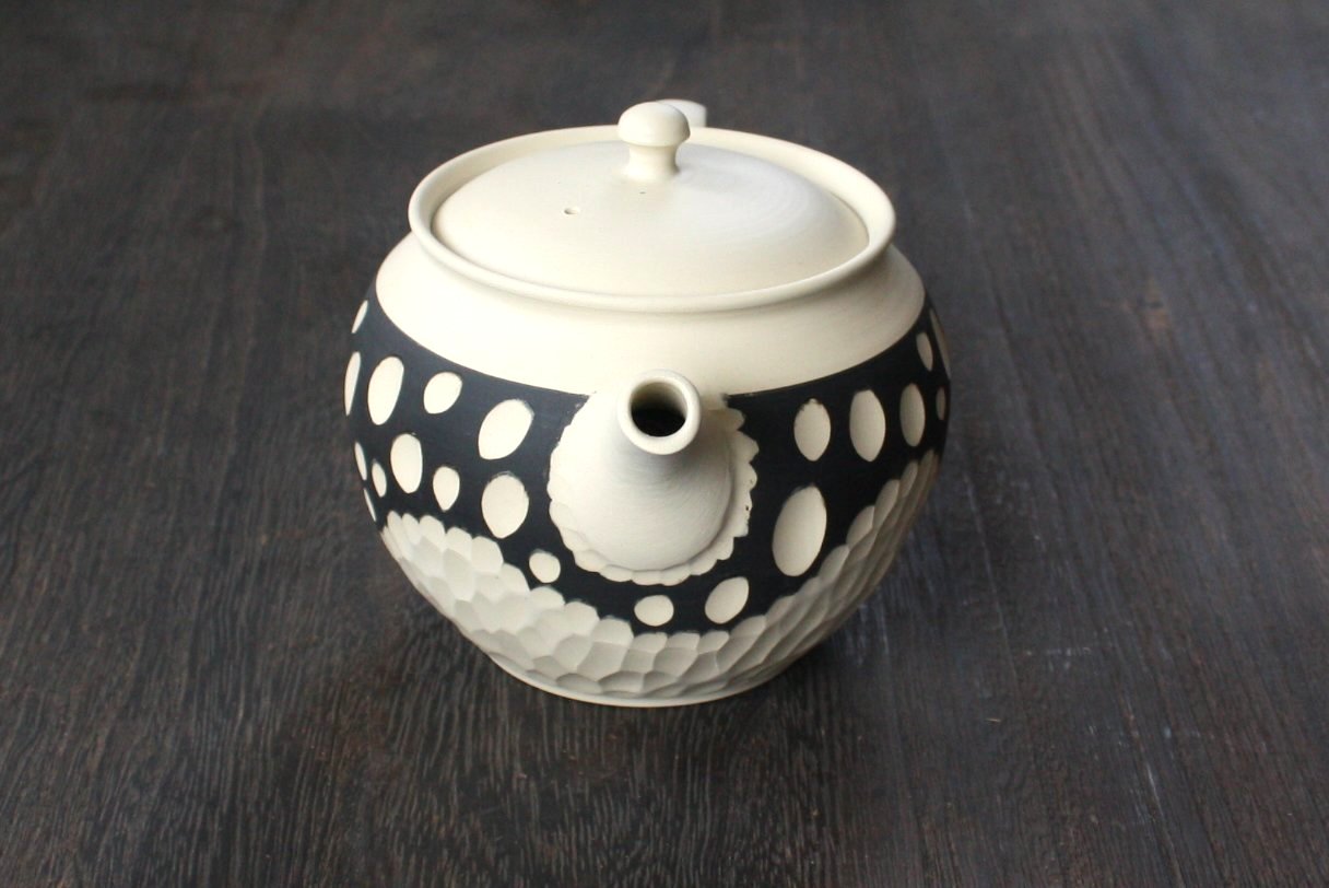 憲児陶苑 白泥ポット 黒水玉カット セラメッシュ(陶製茶こし)kenji016