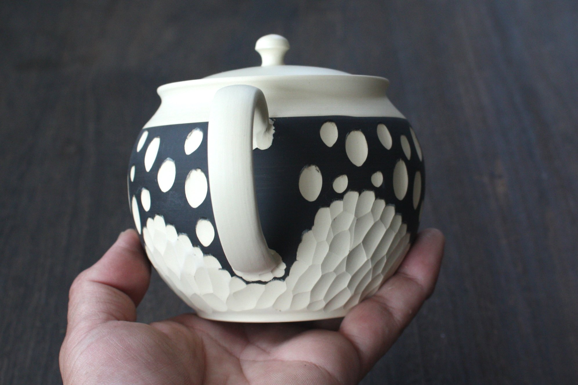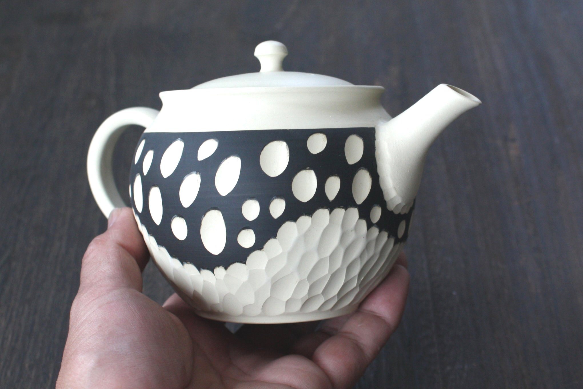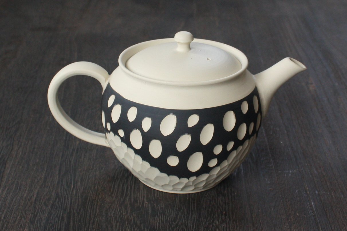 憲児陶苑 白泥ポット 黒水玉カット セラメッシュ(陶製茶こし)kenji016