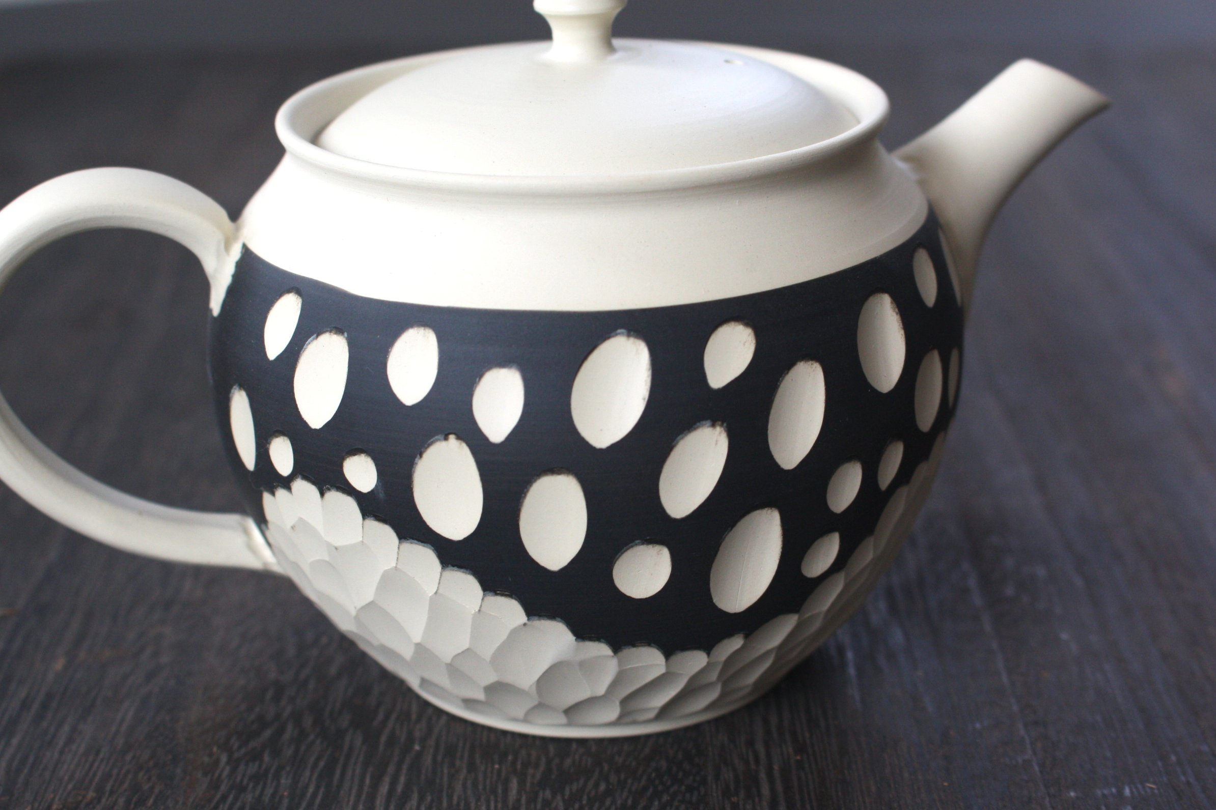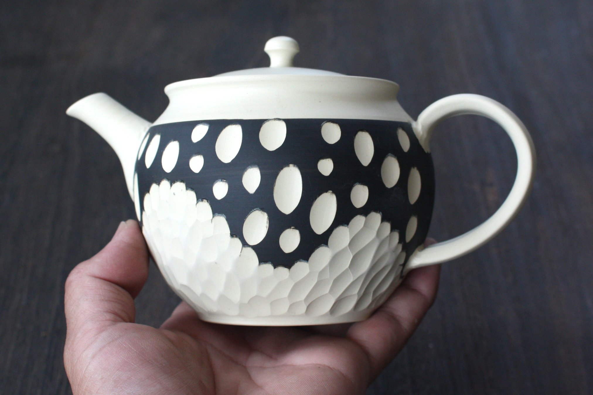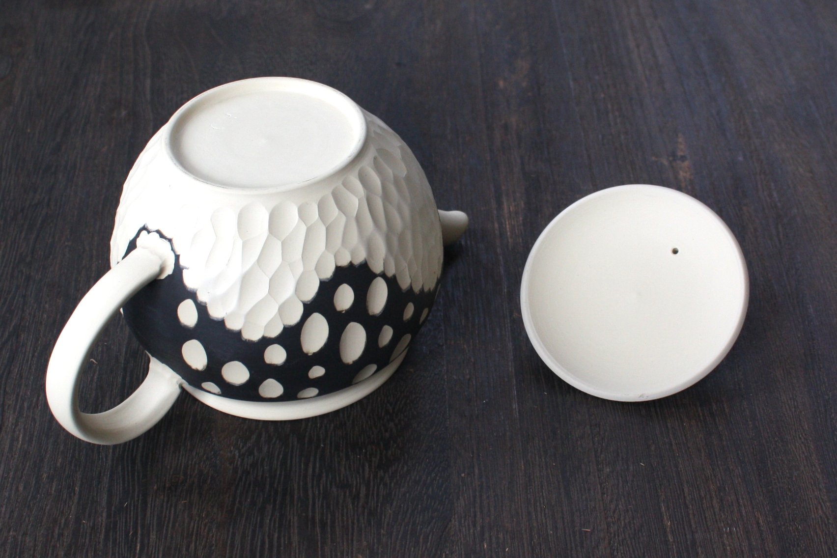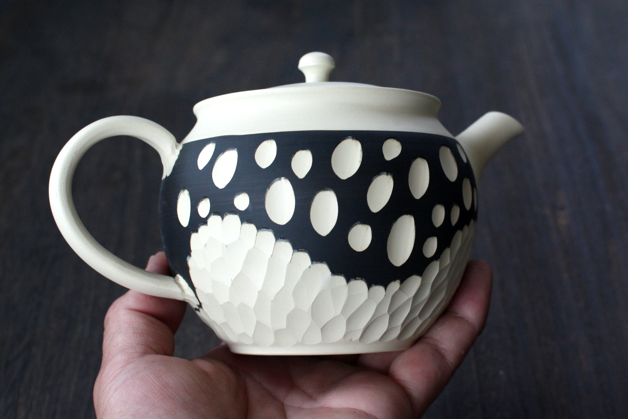 憲児陶苑 白泥ポット 黒水玉カット セラメッシュ(陶製茶こし)kenji016