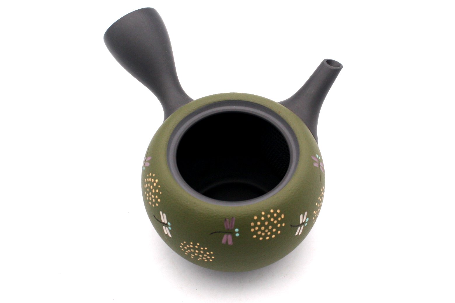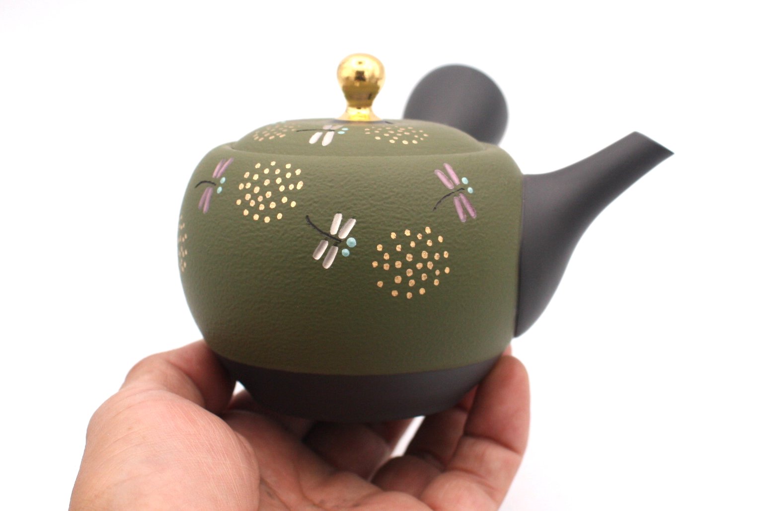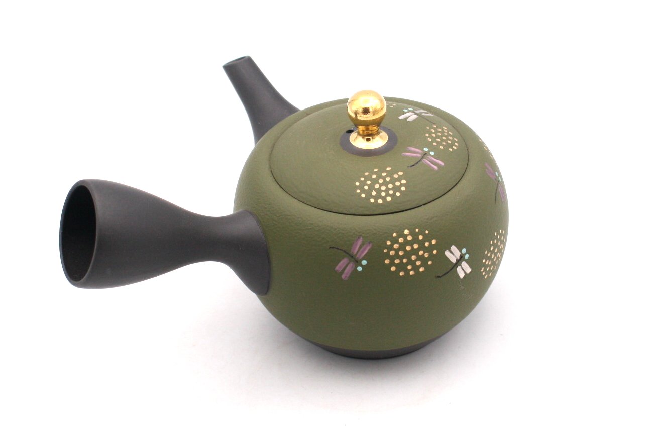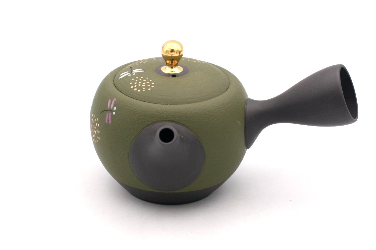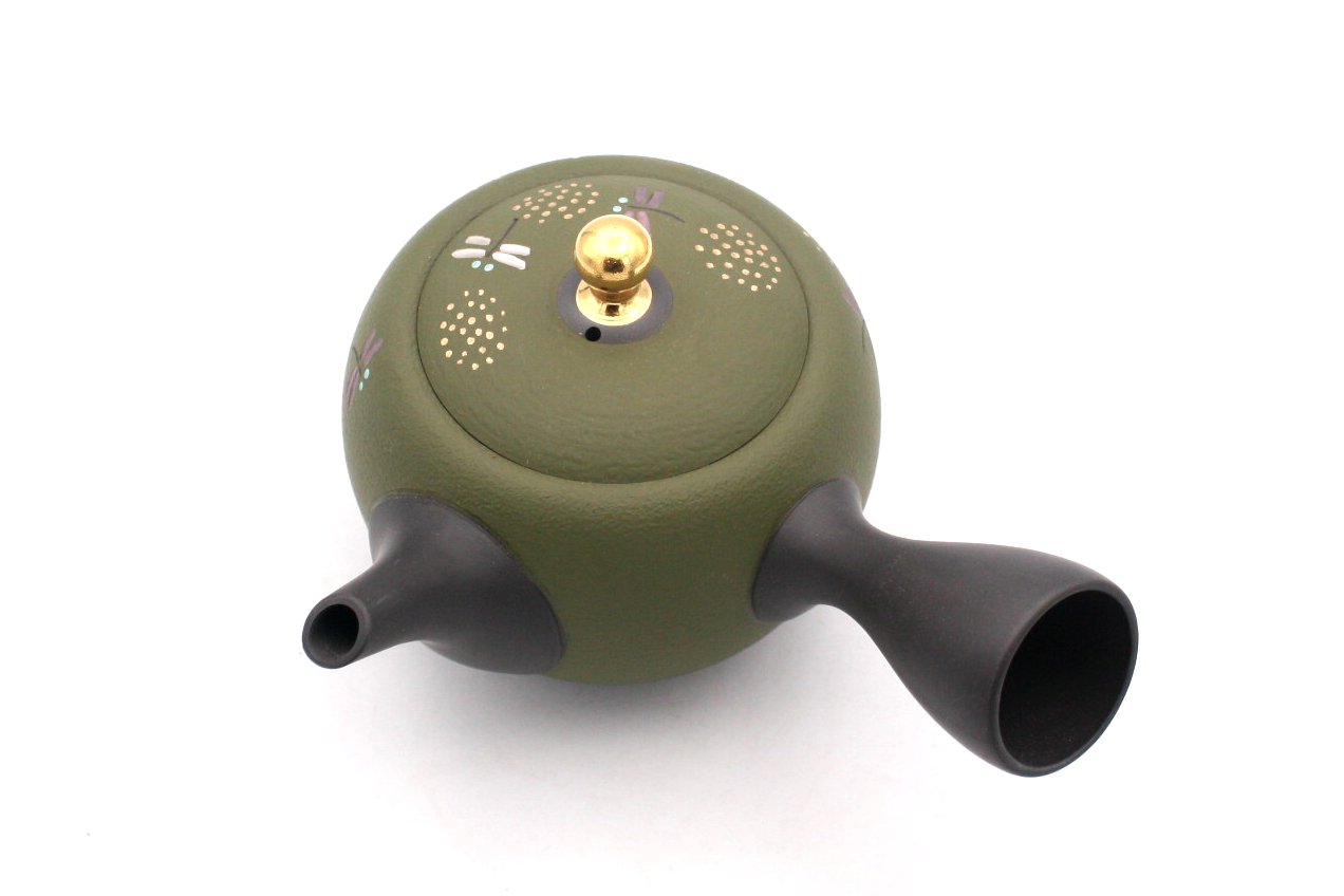 昭萠窯 黒泥金つまみ緑塗とんぼ急須 セラメッシュ(陶製茶こし)shoho036