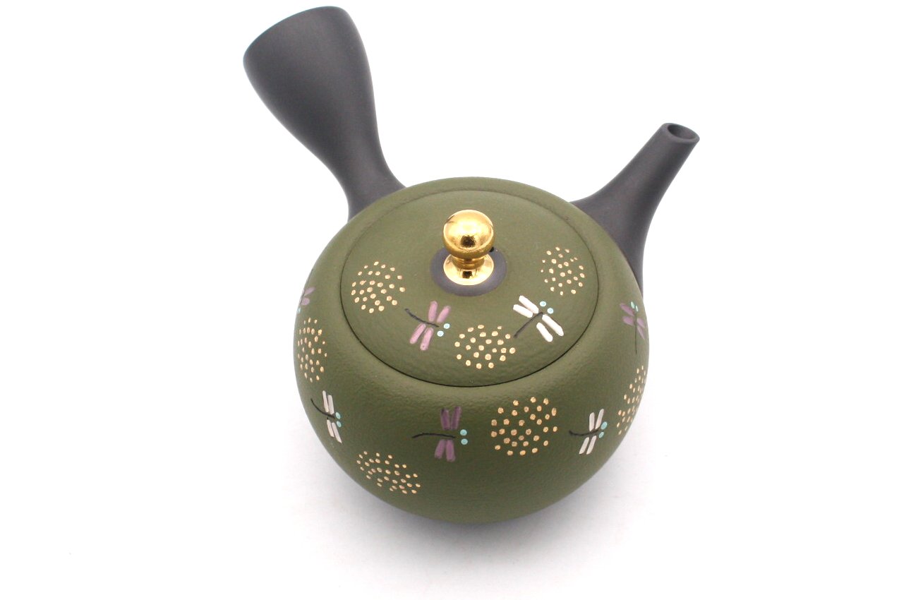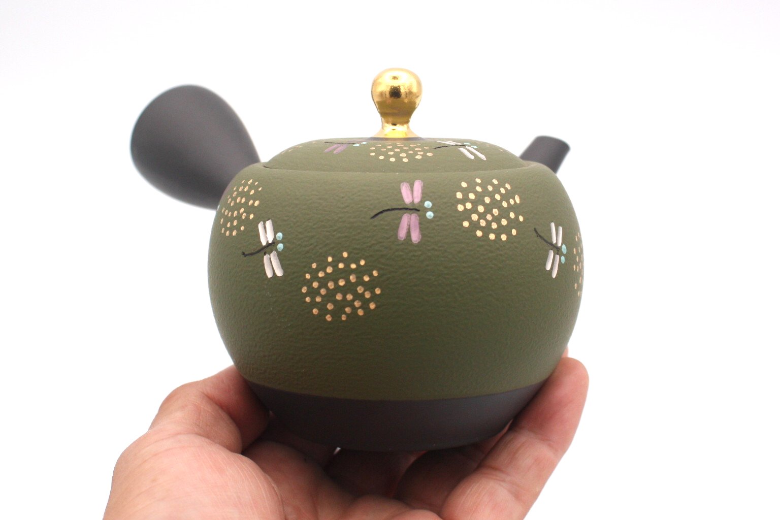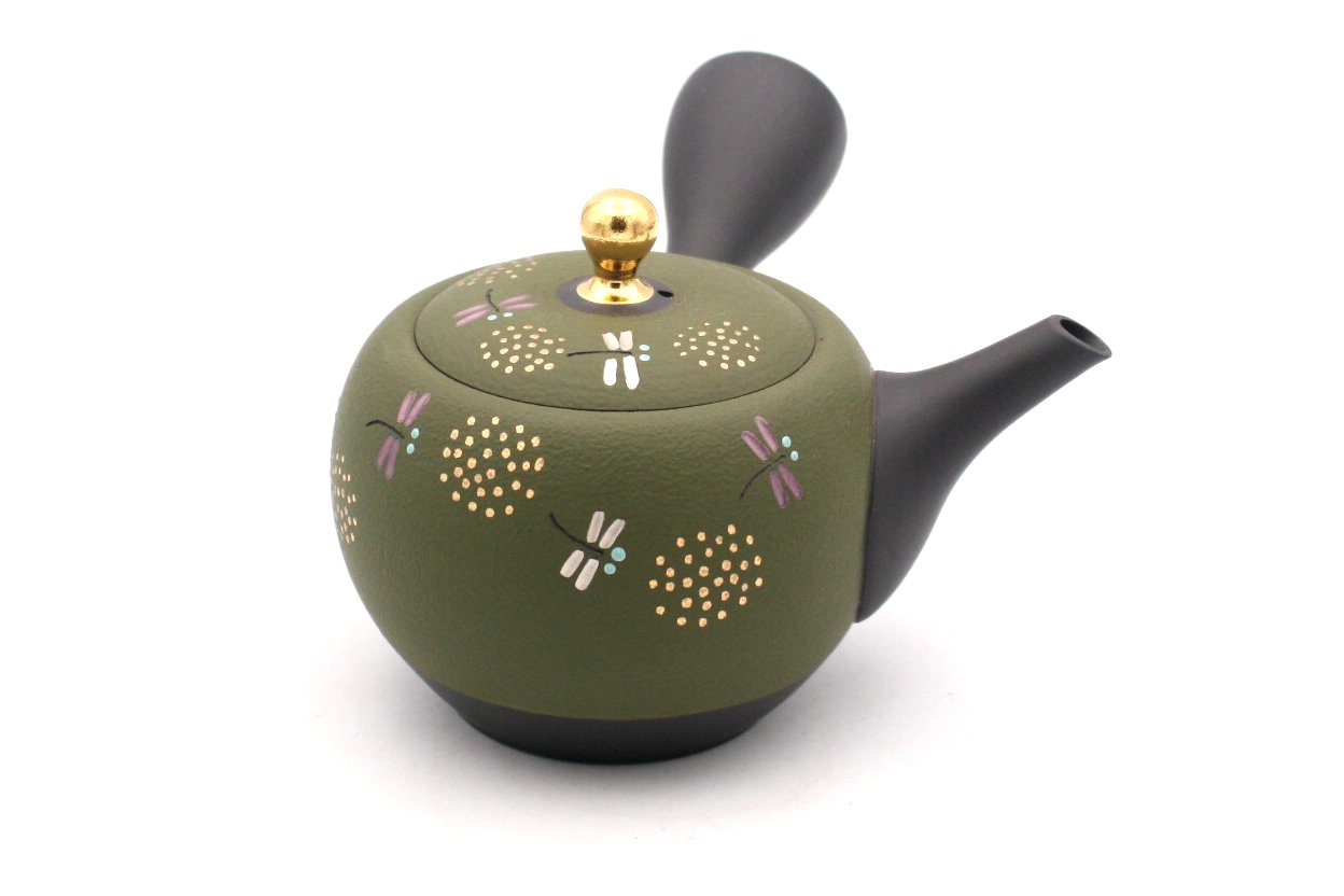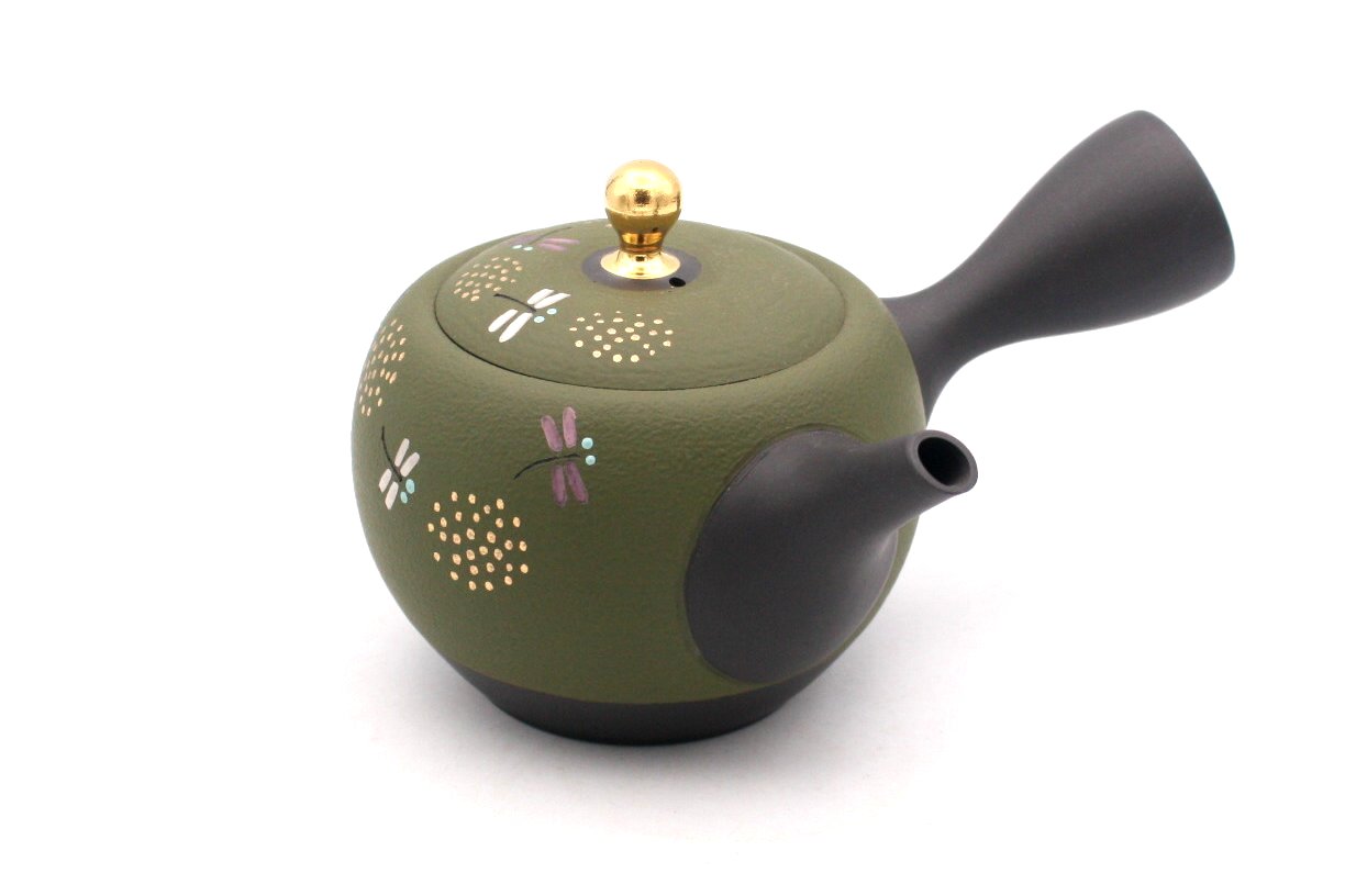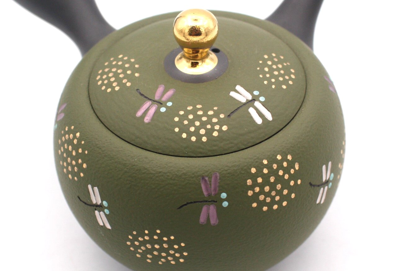 昭萠窯 黒泥金つまみ緑塗とんぼ急須 セラメッシュ(陶製茶こし)shoho036