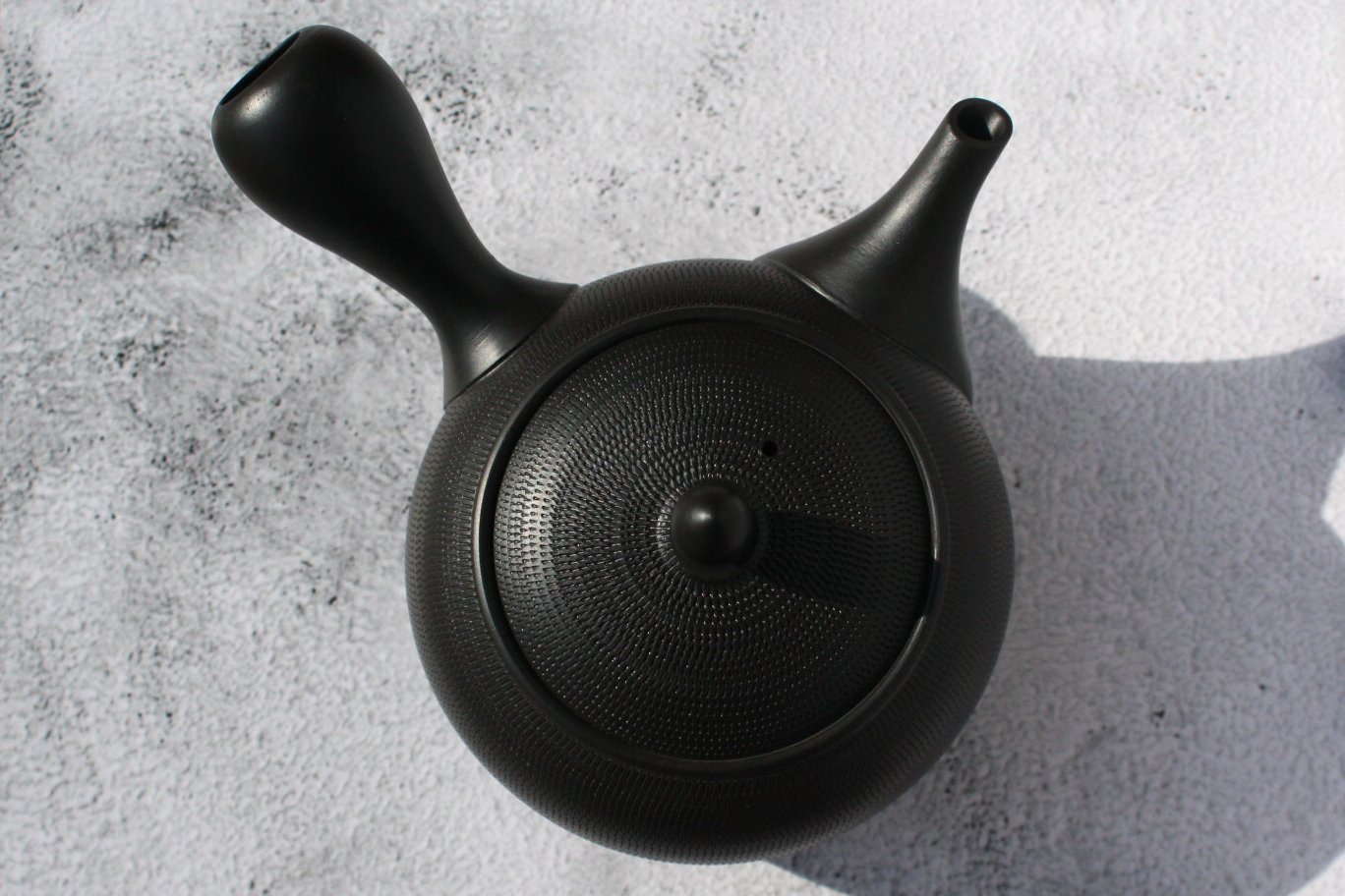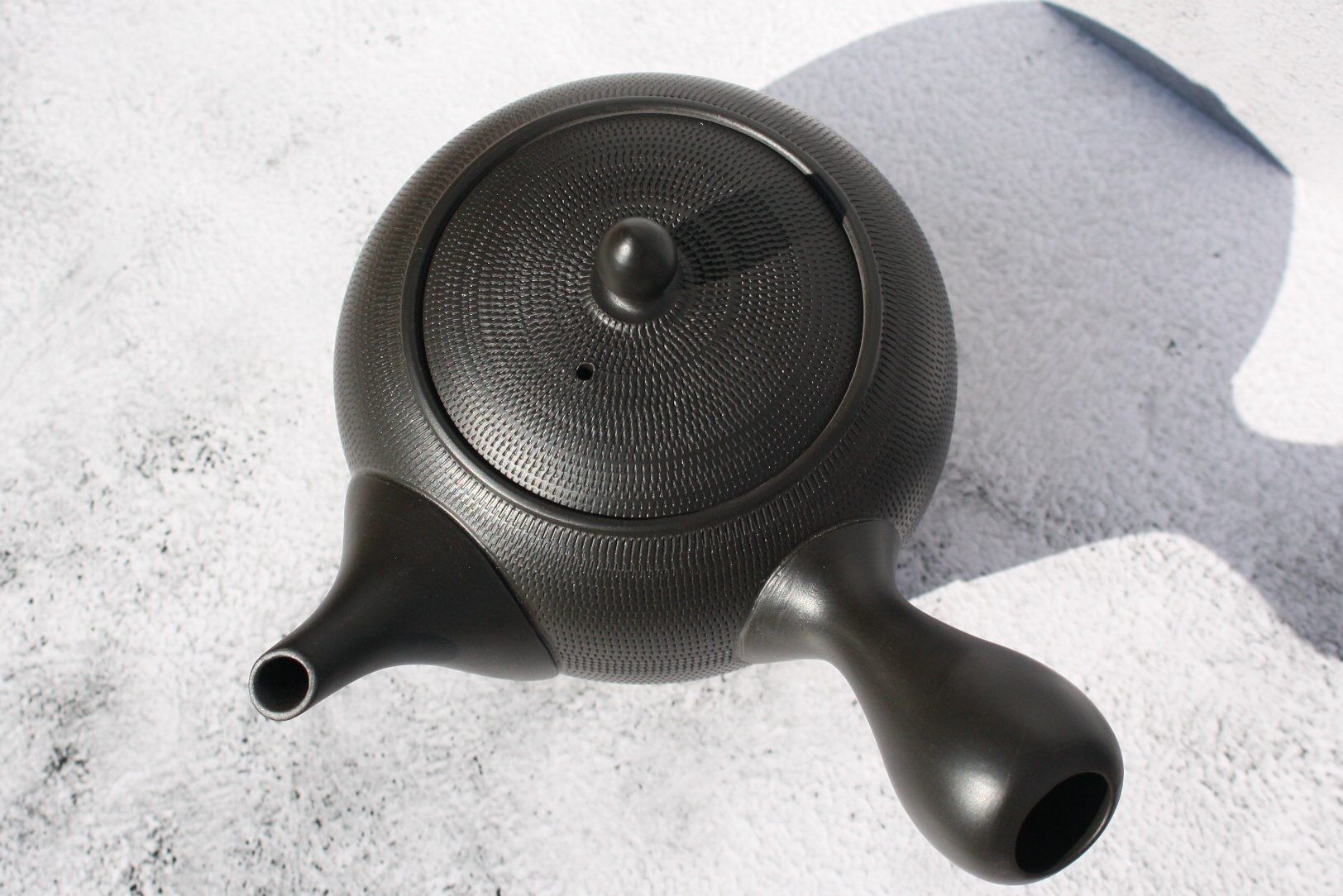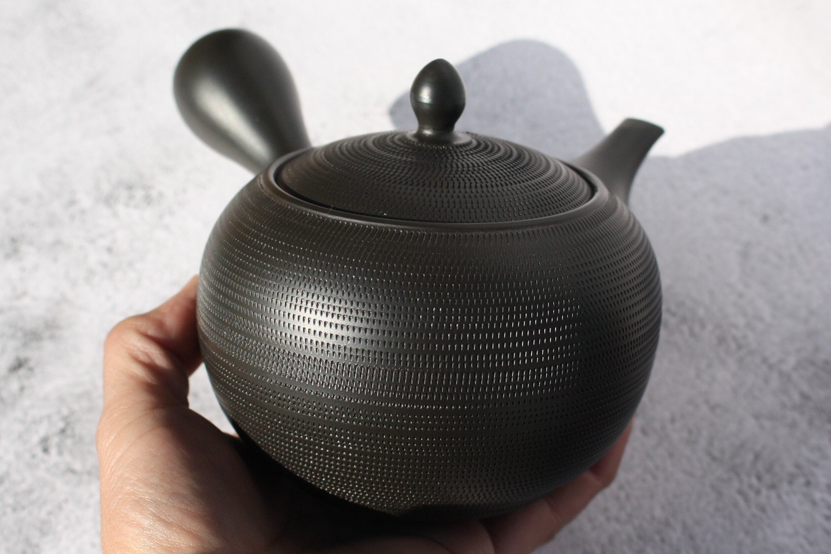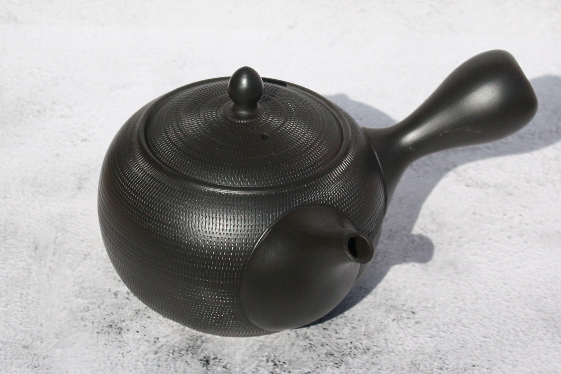 商品説明 春秋窯さんの急須。朱泥陶土をを1100度で焼成した後、炭化焼成を行い黒色に変化させます。たっぷり500mlで3人分(1人120mlとして)陶製茶こしはお茶の風味を損なわず、釉薬を掛けない素地はお茶の渋みを吸着し旨みを引き出す効果があります。表面にはロクロでトビカンナの模様が施されています。注ぎ口の中まで洗える、かんたん茶しぶとりを1つプレゼント。