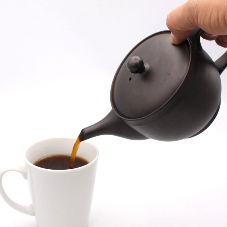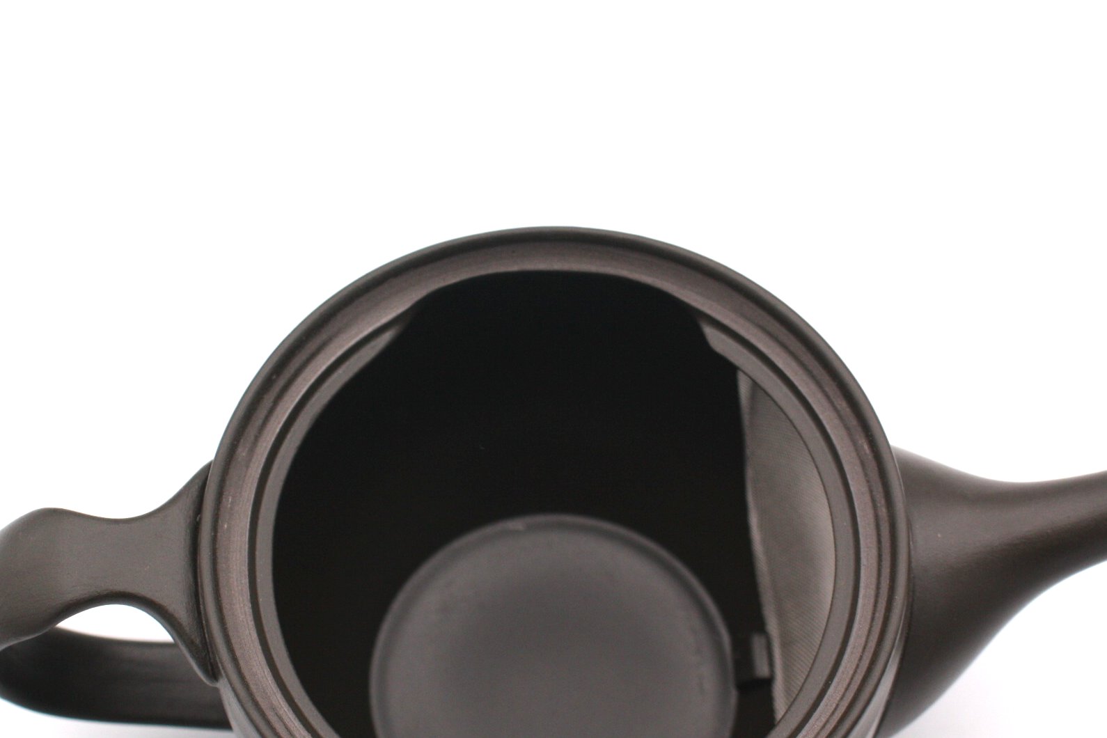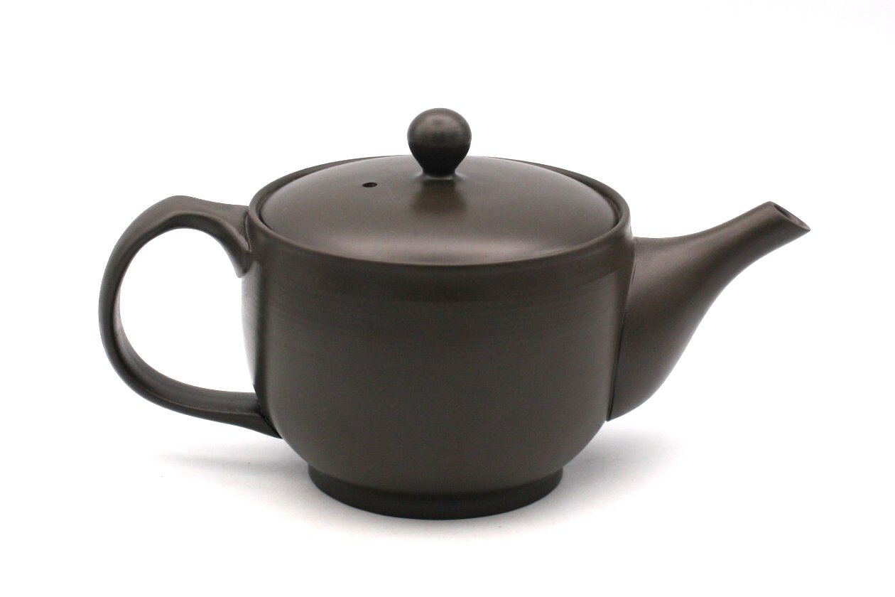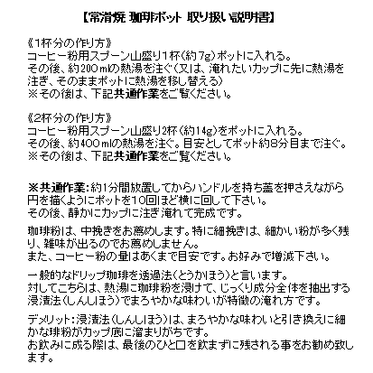 商品説明 常風窯さんのコーヒーポット。朱泥の陶土を1100度で焼成した後に再度炭化焼成を行い黒色に変化させました。ポット型と呼ばれる後ろに持ち手の付いた形状です。ポット型の形状は左利きの方も使用可能で人気の形状です。コーヒーの粉をポットに直接入れて抽出するタイプになります。ステンレスのフィルターはお茶のものより細かな網目になっておりスムーズに抽出できます。中挽き程度の粒度が適しています。釉薬を掛けない素地はコーヒーの渋みを吸着し旨みを引き出す効果があります。本体の蓋が乗る部分を一部取り除いた楽捨て構造で粉の処理が簡単です。注ぎ口の中まで洗える、かんたん茶しぶとりを1つプレゼント。