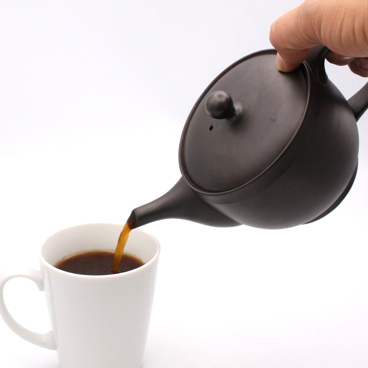 商品説明 常風窯さんのコーヒーポット。朱泥の陶土を1100度で焼成した後に再度炭化焼成を行い黒色に変化させました。ポット型と呼ばれる後ろに持ち手の付いた形状です。ポット型の形状は左利きの方も使用可能で人気の形状です。コーヒーの粉をポットに直接入れて抽出するタイプになります。ステンレスのフィルターはお茶のものより細かな網目になっておりスムーズに抽出できます。中挽き程度の粒度が適しています。釉薬を掛けない素地はコーヒーの渋みを吸着し旨みを引き出す効果があります。本体の蓋が乗る部分を一部取り除いた楽捨て構造で粉の処理が簡単です。注ぎ口の中まで洗える、かんたん茶しぶとりを1つプレゼント。