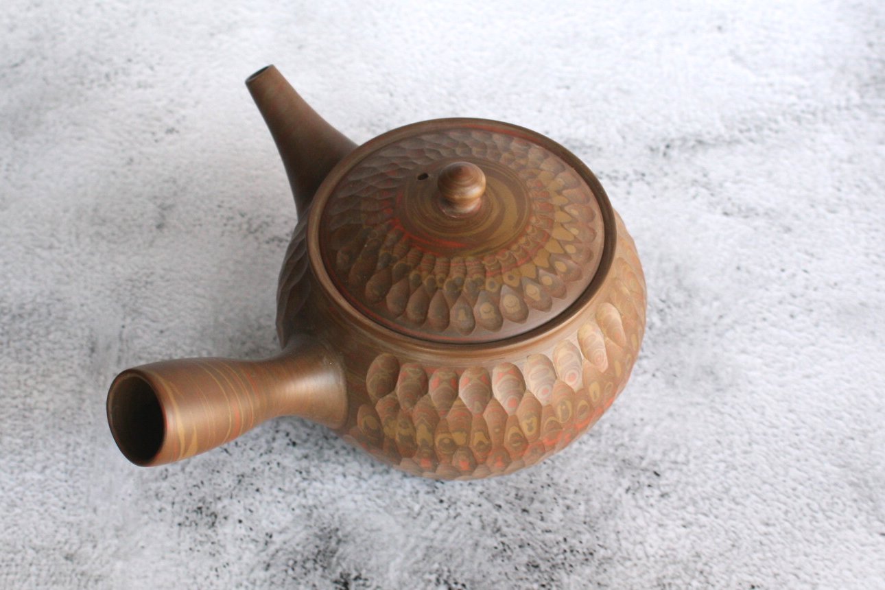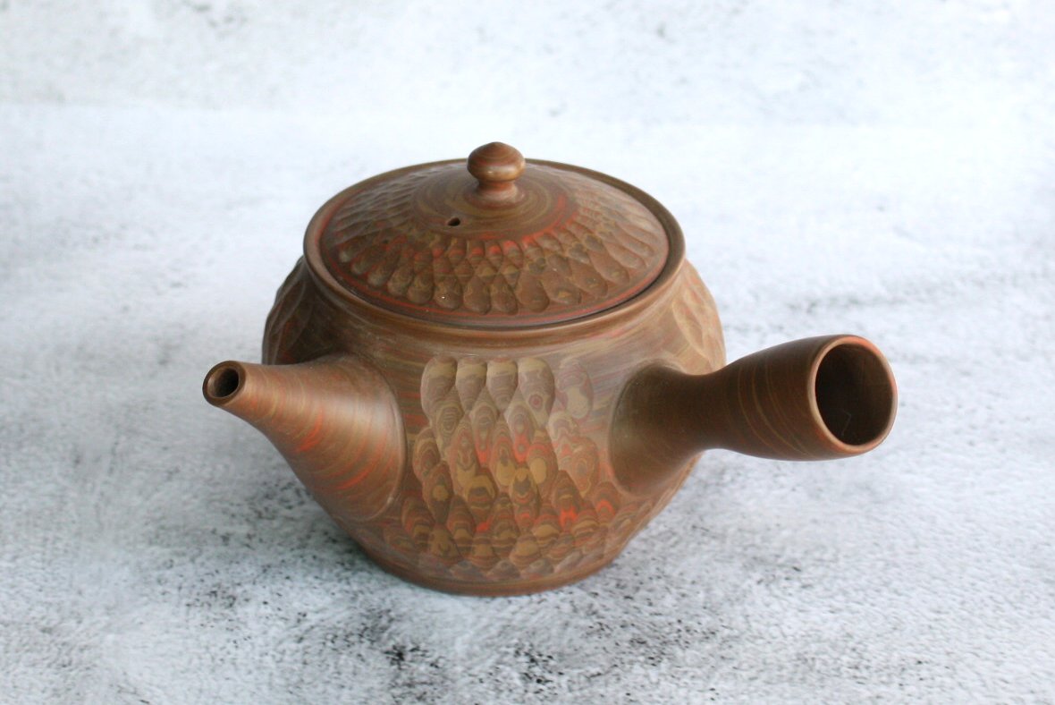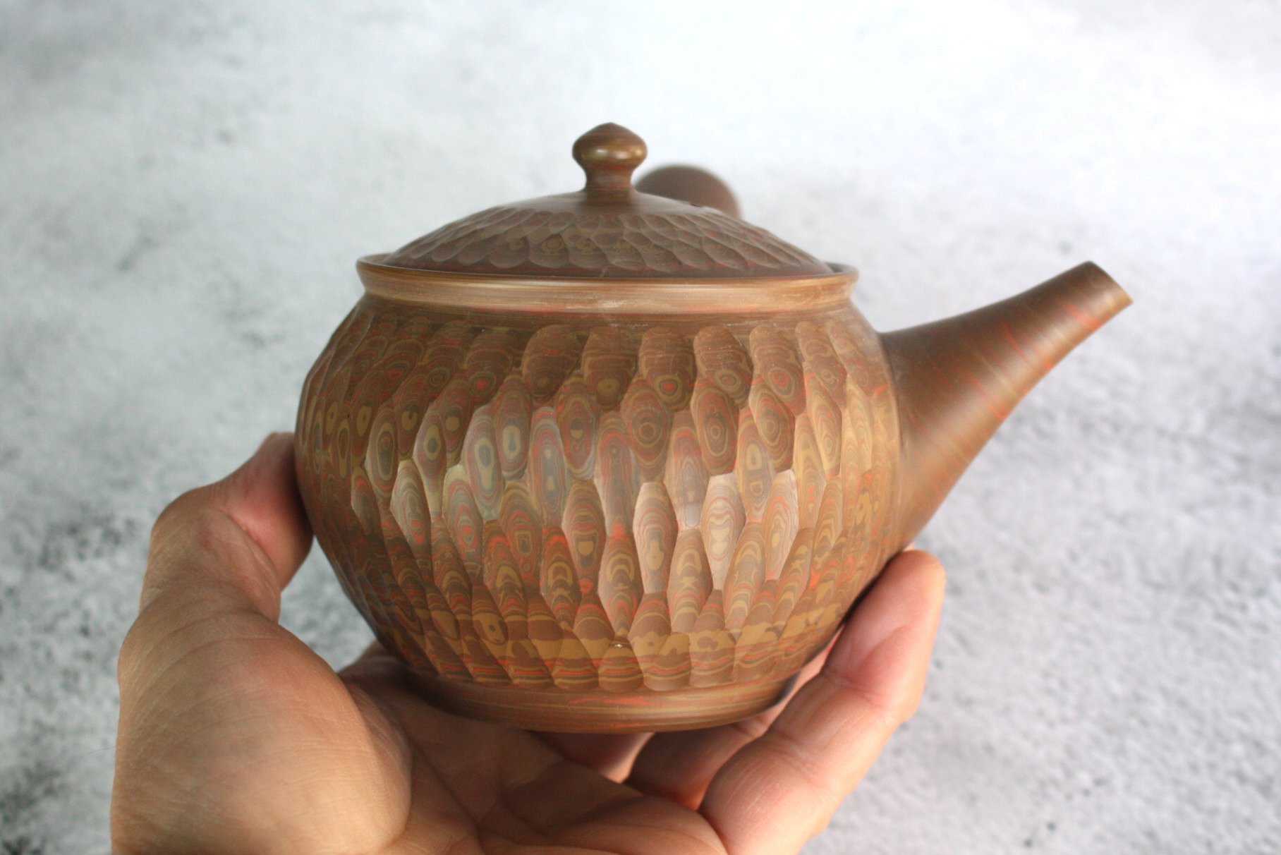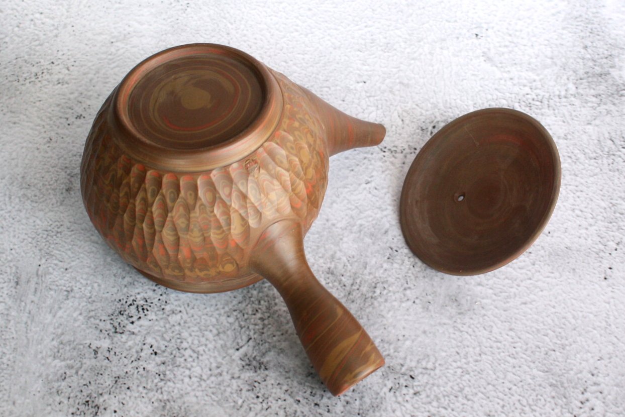 商品説明 小西友仙さんの手造り急須です。練込技法の第一人者として今なお活躍していらっしゃる作り手さんです。練込とは何そうにも積み重ねた粘土を引き上げることでマーブルの模様が出来る技法です。朱、緑、茶の陶土を使用し1100度以上の高温で焼成しています。同じ模様はできません。陶製茶こしはお茶の味を引き出しお茶本来の味を楽しむことができます。注ぎ口の中まで洗える、かんたん茶しぶとりを1つプレゼント。