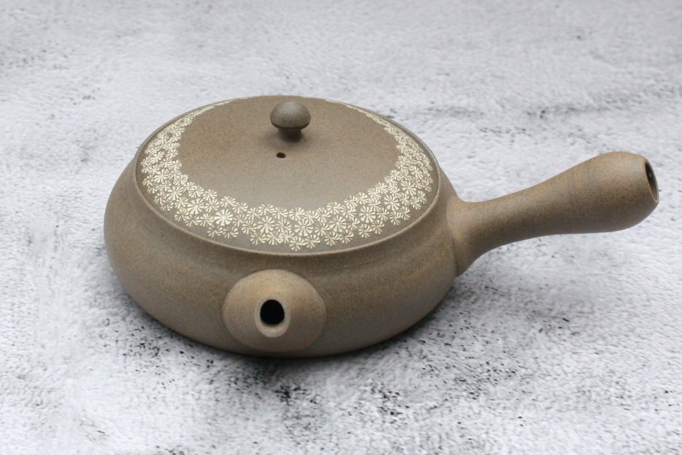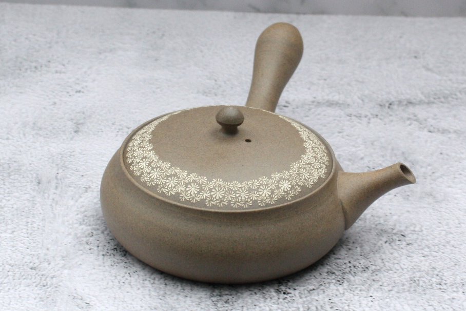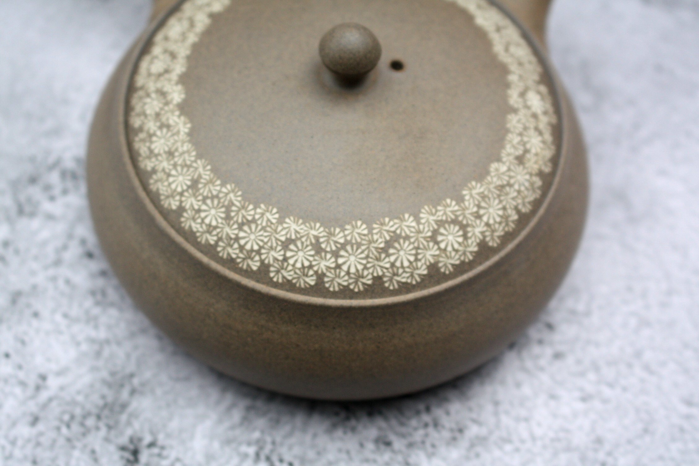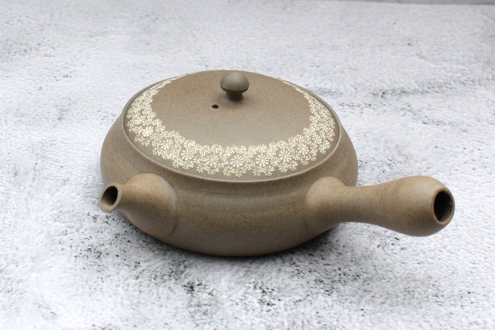 | 商品説明 | 伝統工芸士の都築豊さんの急須。伝統的な常滑焼の技術と独自の感性で作品を作り上げています。蓋の模様は判で押した花の模様(印花)が施されています。ささめ茶こしはお茶の味を損なわず、焼締陶土は土を固め焼いたような肌触りで、お茶の渋みを吸着し旨みを引き出す役割があります。平たい形状はお茶の葉が開きやすく旨味を抽出するのに適しています。注ぎ口の中まで洗える、かんたん茶しぶとりを1つプレゼント。 |